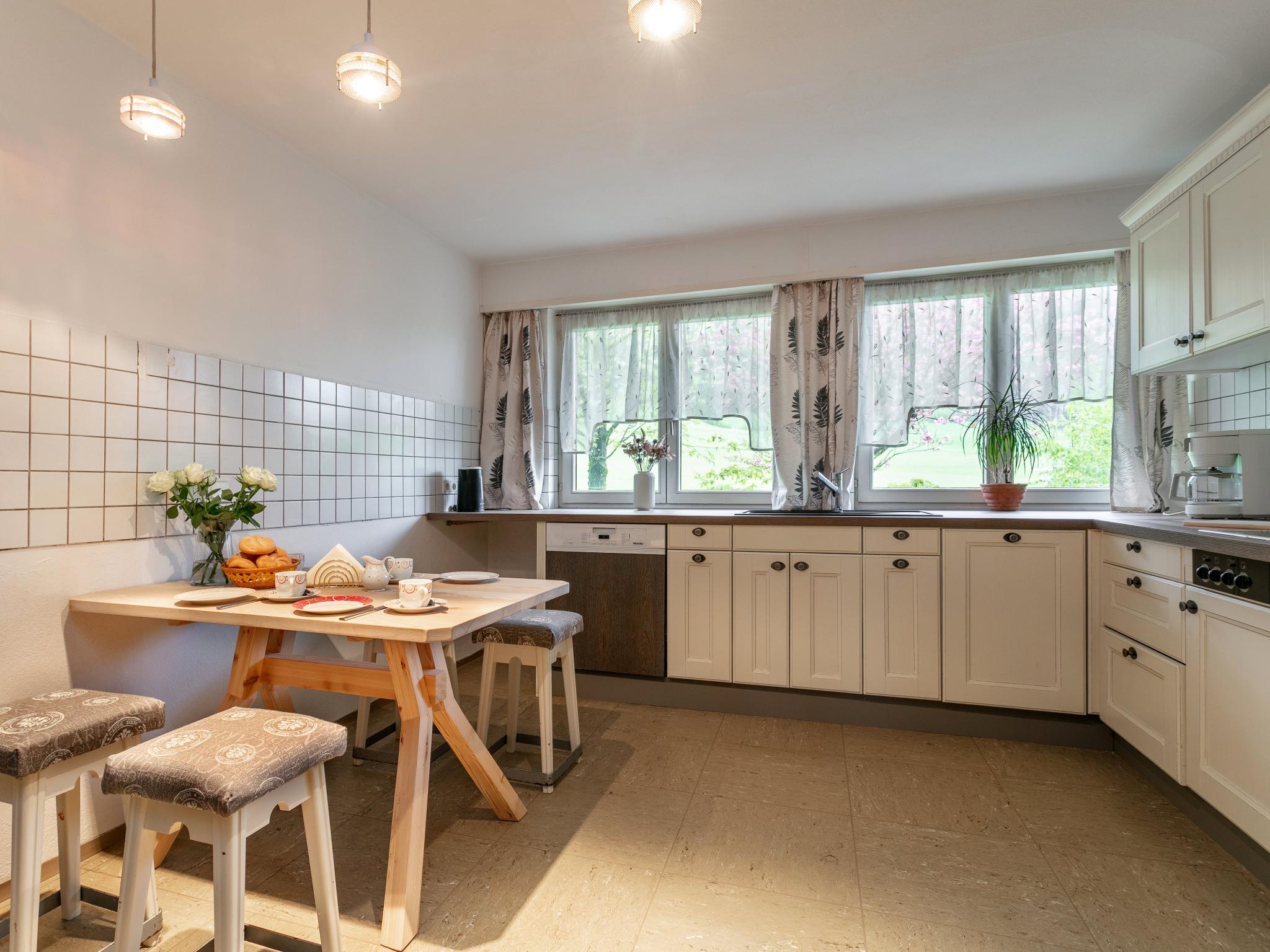 Souterrain: open keuken met waterkoker, fornuis(2 kookplaten, elektrisch), koffiezetapparaat(filtermaling), magnetron, koelkast(+ vriesvak) , woon/eetkamer met 2-pers. slaapbank(160 x 200 cm), TV, eettafel(4 personen), zithoek , slaapkamer met 1-pers. bed(90 x 200 cm), wasbak , slaapkamer met badkamer met 2-pers. bed(2 éénpersoonsbedden, 180 x 200 cm), wasbak, douche , toilet met wasbak, wc , toilet met wastafel, wc , saunaruimte met wasbak, douche, sauna , skiberging(buitenom bereikbaar), terras met eettafel(2 personen)