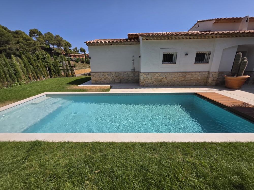 Heerlijke villa met airconditioning, privé zwembad, jacuzzi én zeezicht, plus vier slaapkamers en twee badkamers.De woning, het zwembad en de terrassen zijn allemaal gelijkvloers. Het privé-zwembad en een deel van de tuin liggen aan de achterzijde van het huis, waardoor u over veel privacy beschikt rondom het zwembad. Behalve een zwembad is er aan de andere zijde van het huis ook nog een jacuzzi. Van hieruit kijk je prachtig uit over zee! Bij het zwembad staan ligbedden. Aan de achterkant van het huis is een groot overdekt terras met een loungeset en een stenen barbecue en nog terrassen met allemaal schitterend uitzicht op zee.De woonkamer is ruim en gezellig ingericht. Vanuit de woonkamer kijkt u uit over de  Middellandse zee en de omliggende heuvels.De woonkamer heeft een open verbinding naar de keuken. De woning is voorzien van dubbele beglazing en centrale verwarming. De villa heeft twee luxe badkamers, waarvan één ensuite met douche. De ander is voorzien van een ligbad, douche, dubbele wastafel, toilet en bidet. De woning is voorzien van veel ramen, waardoor u naar alle kanten kunt genieten van het uitzicht. De ramen kunnen worden afgeschermd met elektrische rolluiken.De volledig ingerichte keuken heeft als bijzonderheid het hoge aanrecht van 1m. U beschikt o.a. over een ruime koel- en vrieskast, magnetron/grill, elektrische kookplaat, afzuigkap en een vaatwasmachine.De villa heeft vier slaapkamers. Twee slaapkamers hebben een tweepersoonsbed en twee slaapkamers hebben twee 1-persoonsbedden.De woning beschikt boven over een garage. Vanuit de garage komt u met een trap naar beneden direct in de woning. De woning beschikt tevens over wasmachine en droger.