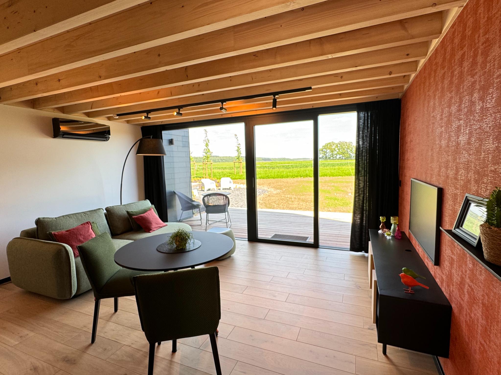 hottub(verwarmd door vuur), verwarming(warmtepomp), airconditioning, tuinmeubilair, 5x parking, zwembad(gedeeld met andere gasten, geopend van Mei t/m Sep), buitenhaard