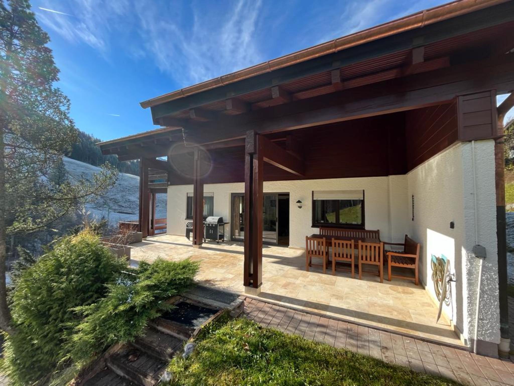 De schuifpui biedt toegang tot het grote overdekte terras, waar je geniet van de eigen tuin en vergezichten over bergen. De parkeergelegenheid op eigen terrein is groot genoeg voor drie auto's. Het huis is gelegen aan de verbindingsweg tussen de dorpen Maria Alm en Hinterthal, en is bereikbaar via een kleine bergweg die je (na 200 meter) bij het huis brengt. Een zeer rustige locatie, maar toch centraal gelegen met de skibus om de hoek. In een paar minuutjes met de auto ben je in het centrum van Maria Alm. Het gezellige dorpsplein is omringd met leuke terrasjes. Vanuit het dorp gaat de eerste skilift (ook in de zomer) die direct verbinding geeft tot het gehele Hochkönig Skigebied.