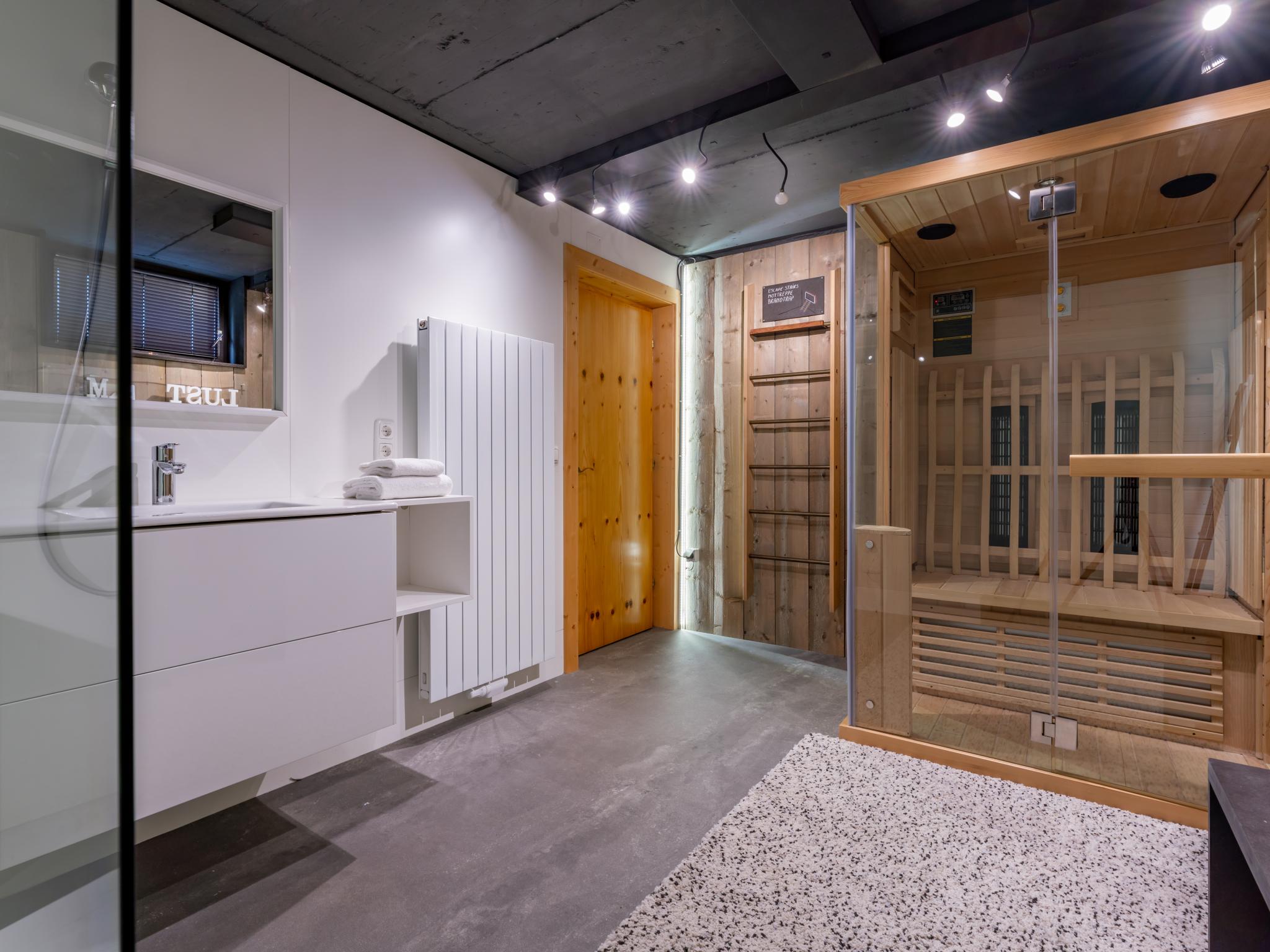 Souterrain: slaapkamer met 1-pers. slaapbank, 2-pers. bed , badkamer met douche, infraroodsauna, wastafel , wasruimte met wasdroger, wasmachine