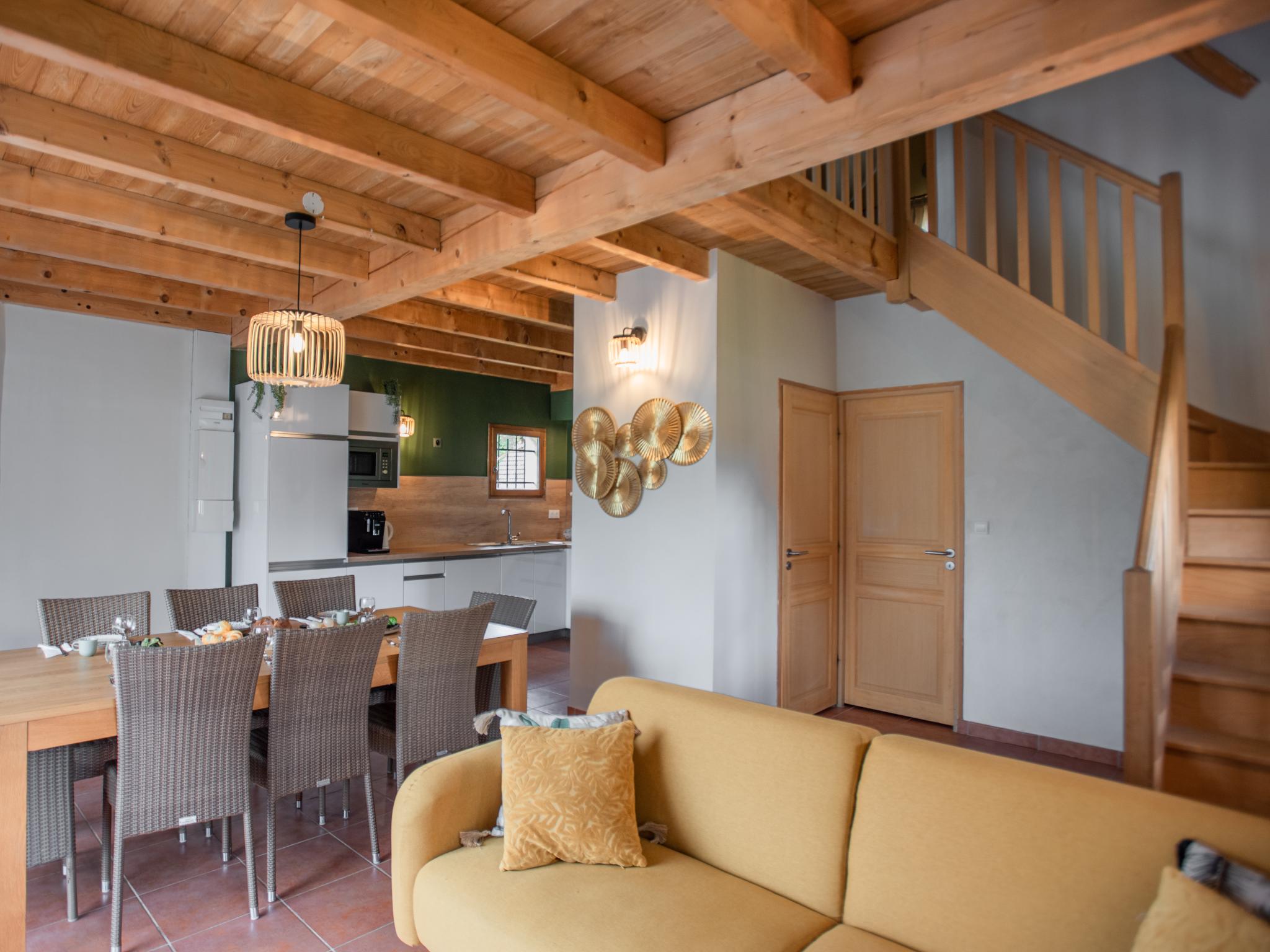 Begane grond: woonkamer met TV(geen Nederlandse zender(s)), zithoek , eetkamer met eettafel , open keuken met fornuis, afzuigkap, koffiezetapparaat(filtermaling), oven, magnetron, afwasmachine, koel-/vriescombinatie , slaapkamer met 2-pers. hoogslaper , slaapkamer met badkamer met 2-pers. bed, douche, wastafel , berging, wc, airconditioning