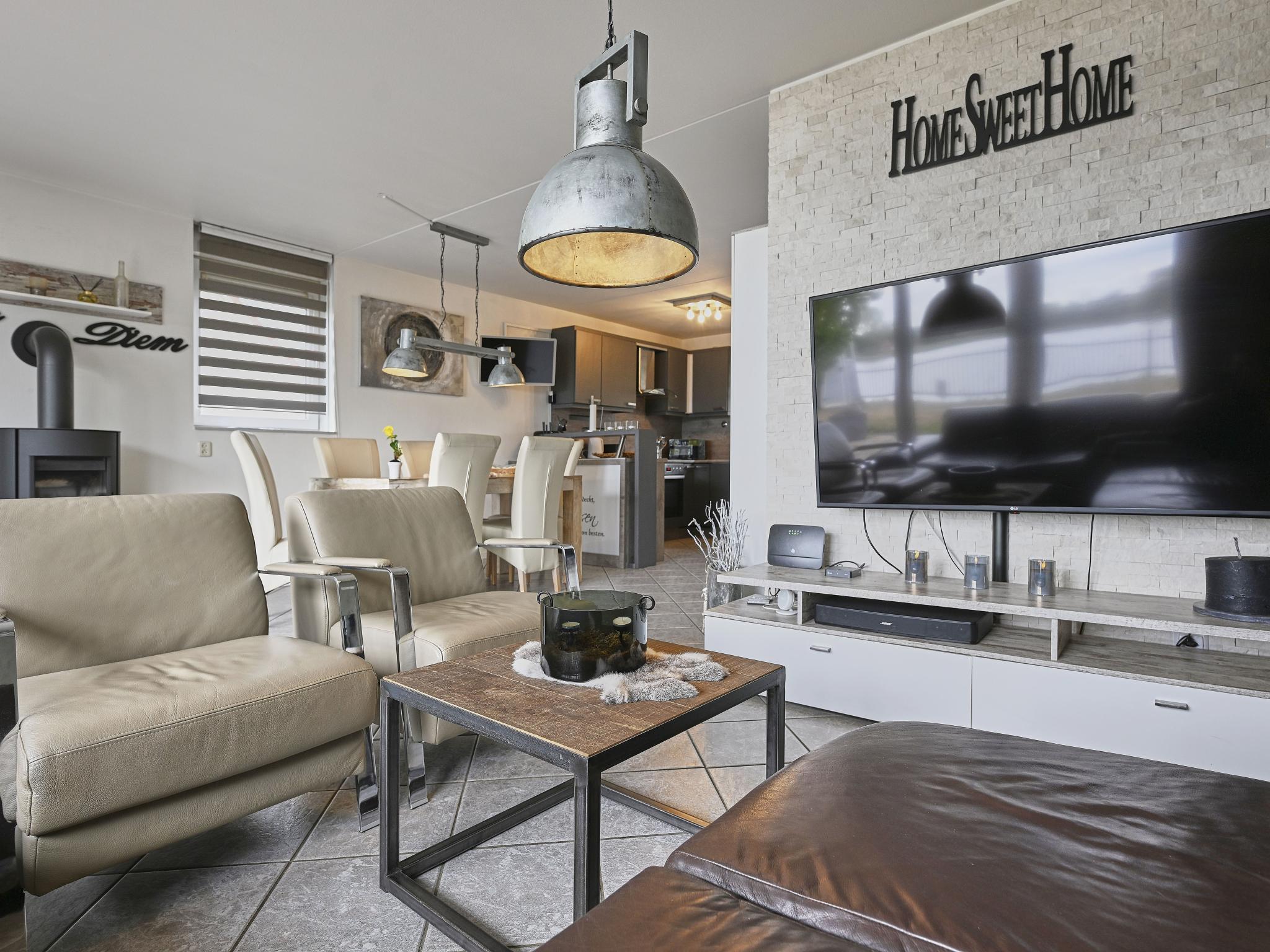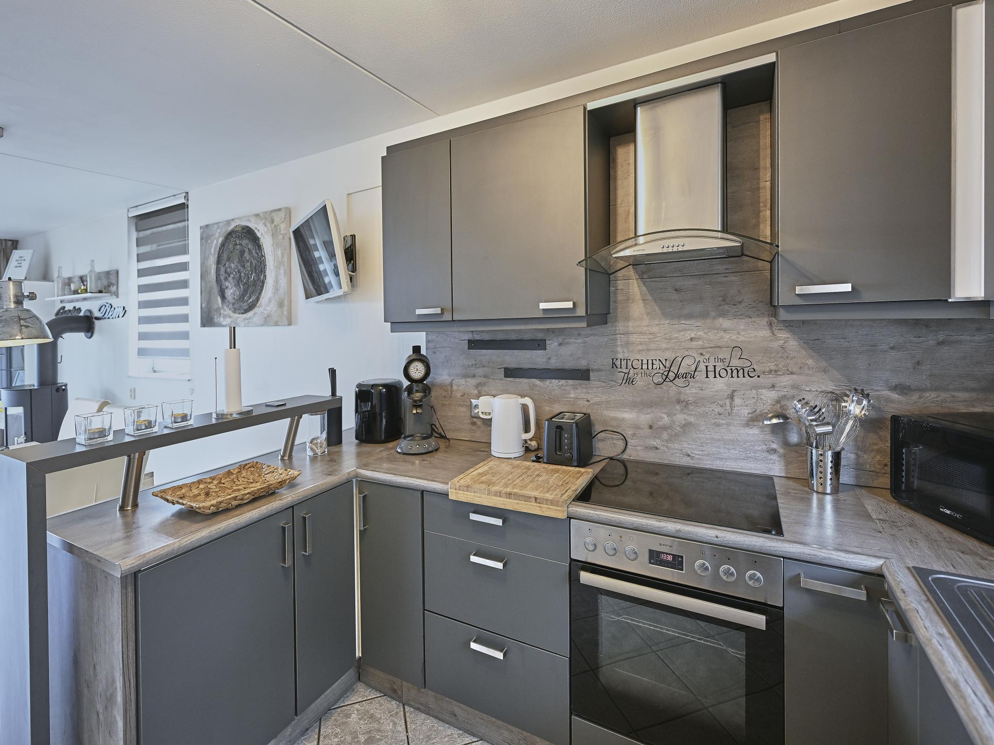 Begane grond: open keuken met TV, kookplaat(4 kookplaten, elektrisch), waterkoker, broodrooster, afzuigkap, koffiezetapparaat(senseo pads), oven, magnetron, afwasmachine, koel-/vriescombinatie , woon/eetkamer met TV(smart TV), kachel(hout), zithoek , toilet met wc , berging met wasmachine