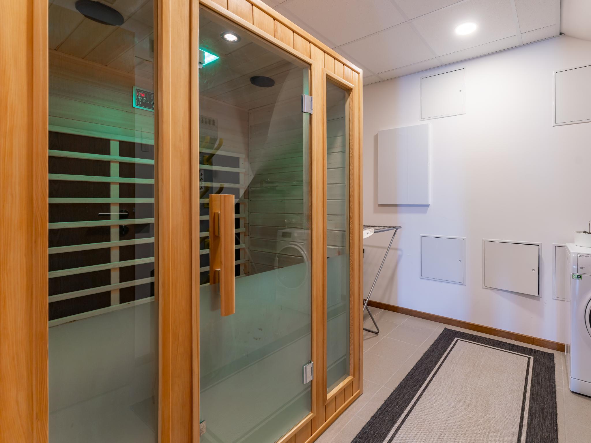 Begane grond: hal, slaapkamer met badkamer met 2-pers. bed(boxspring), stapelbed, douche, wastafel, wc, haardroger , berging met wasdroger, wasmachine, skischoenverwarmers, strijkplank, strijkijzer , infraroodsauna