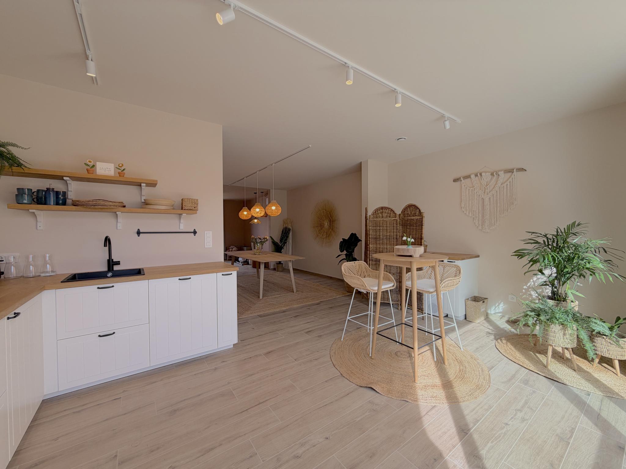 Begane grond: hal, keuken met kookplaat(4 kookplaten, inductie), waterkoker, afzuigkap, koffiezetapparaat(nespresso cups), oven, magnetron, afwasmachine , woon/eetkamer met TV(smart TV), eettafel(10 personen), airconditioning , toilet, bijkeuken met wasdroger, wasmachine , 1x kinderstoel