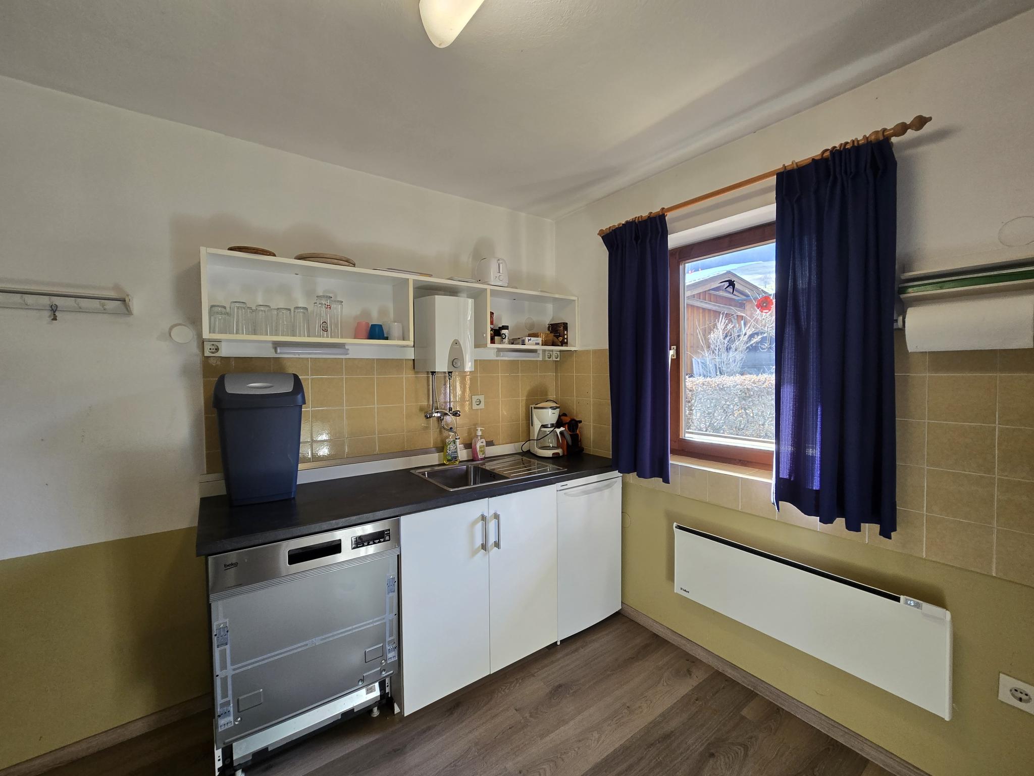 Op de 1e etage: keuken met fornuis(4 kookplaten), koffiezetapparaat(filtermaling, nespresso cups), oven, magnetron, afwasmachine, koel-/vriescombinatie , woon/eetkamer met TV, eettafel(4 personen), kachel(hout), zithoek , slaapkamer met 2-pers. bed(180 x 200 cm) , badkamer met bad met douche, wasbak , toilet met wasbak, wc , balkon